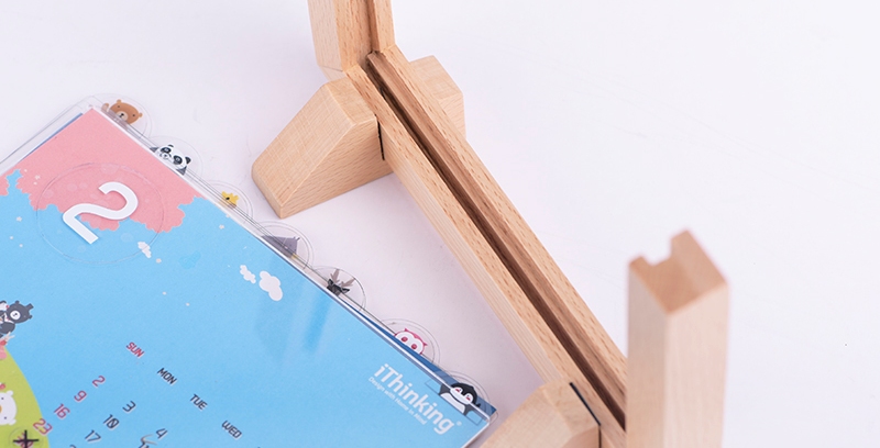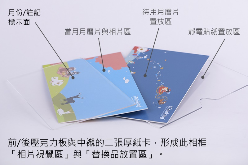 為保持整體相框萬年曆的正面清爽視覺,特別在相框底槽採雙階層次設計,讓暫時未用到的透明月曆片及靜電貼紙乖乖隱身在後。