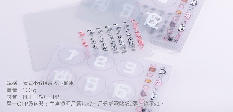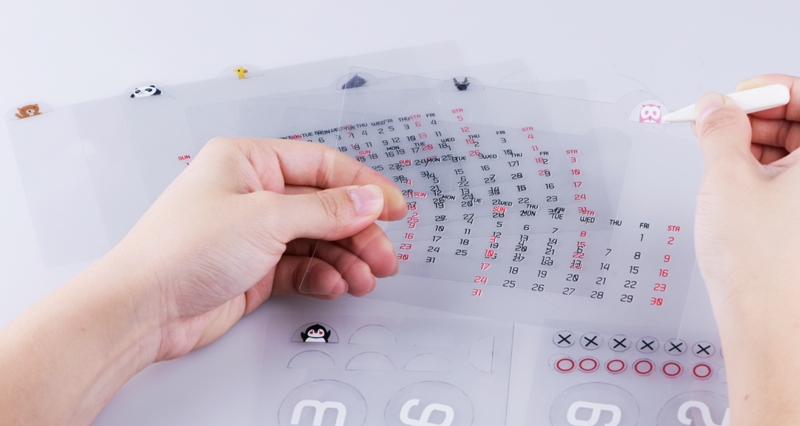 為使7張透明片更易區隔,除在7張不同月曆透明片頂端,以不同位置的半圓弧作區隔外,更備有7款不同可愛圖案靜電貼紙,供使用者自行選用貼在半圓弧上,以利選用時做快速辨別。