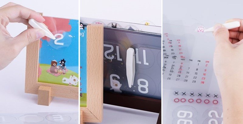 月份的處理上,以全無膠靜電貼紙規劃了1~12月的數字,及多個XX與OO小貼標,讓您能隨意且重複使用貼附在相框正面,及在月曆上標示當月重要或沒必要的日子。