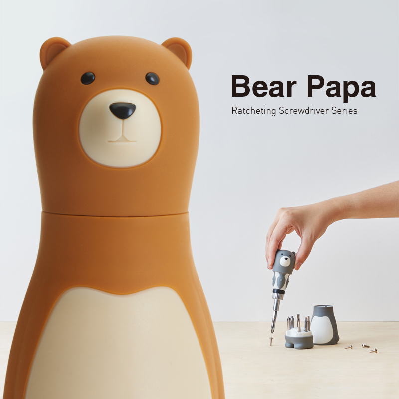 The bear-shaped screwdriver body is made of environmentally friendly and highly resilient engineering-grade PP plastic as the base material, with a TPR environmentally friendly rubber coating to improve grip comfort and enhance the friction required for applying force. To ensure the quality and refinement during future production, it is manufactured using a two-color injection molding process. The center ratchet screwdriver seat is made of chromium vanadium (Cr-V) alloy steel, and the Bits screwdriver bit is made of silicon alloy steel (S2), both with chrome-plated anti-rust treatment—materials preferred for professional-grade tools.