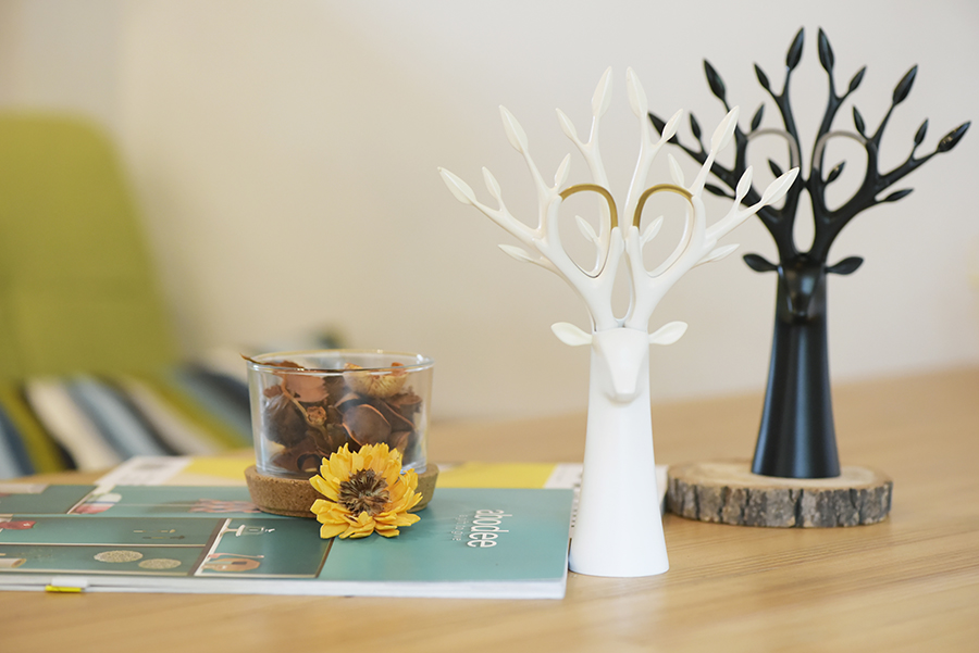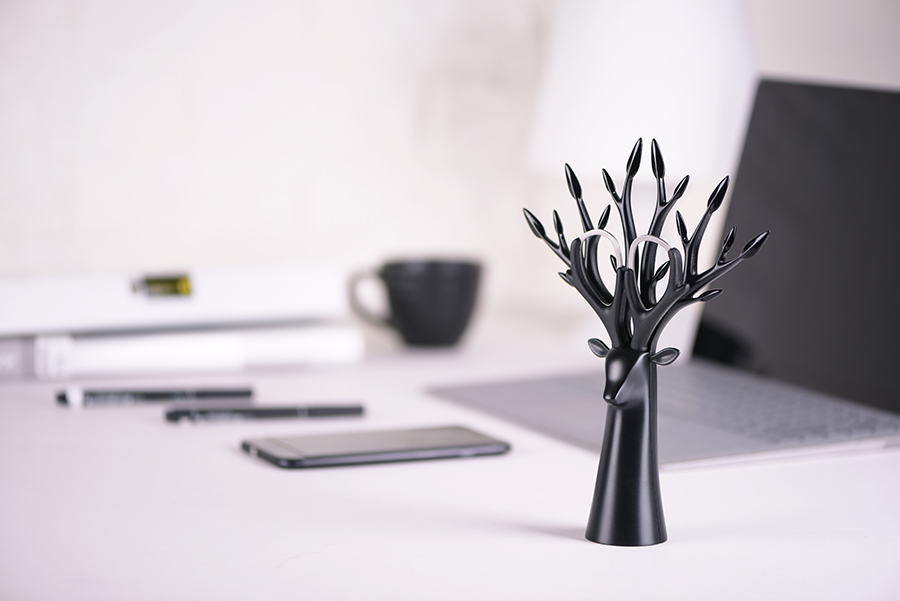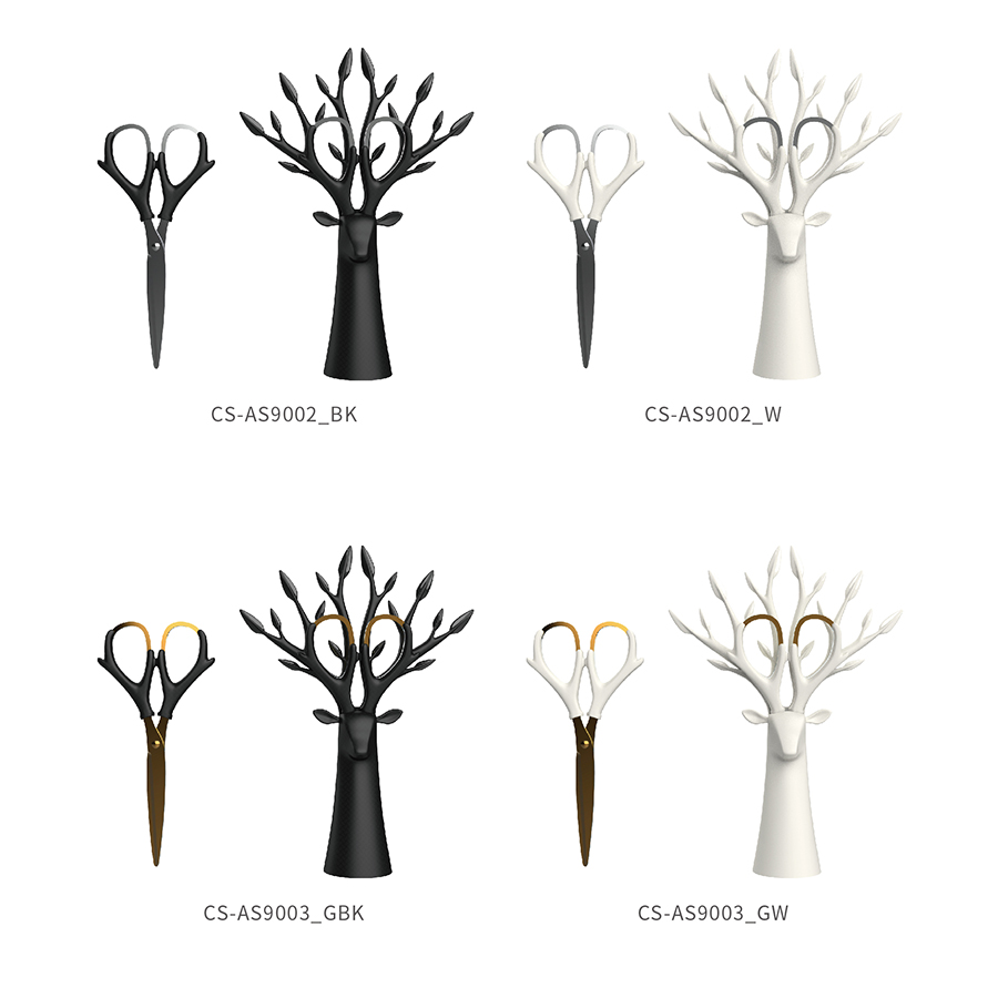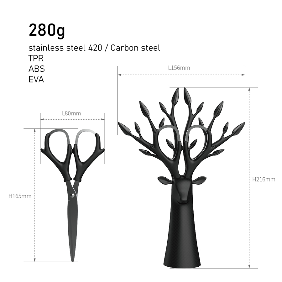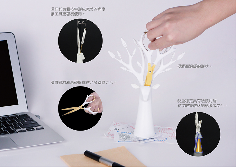 以長、直、圓錐、幾何交錯為主型,藉由部分鹿形樹身長成的樹枝,向上幻化成鹿角造型的枝幹,是角、是枝、是握把的意象交錯,是大自然生命奧妙的隱喻,是佇立辦公桌前的優雅清新,是擺開惱人煩雜事務的片刻寧靜;順角形拉起的是剪刀自成的握把,果斷決行修剪紛亂思緒,繼續開始!