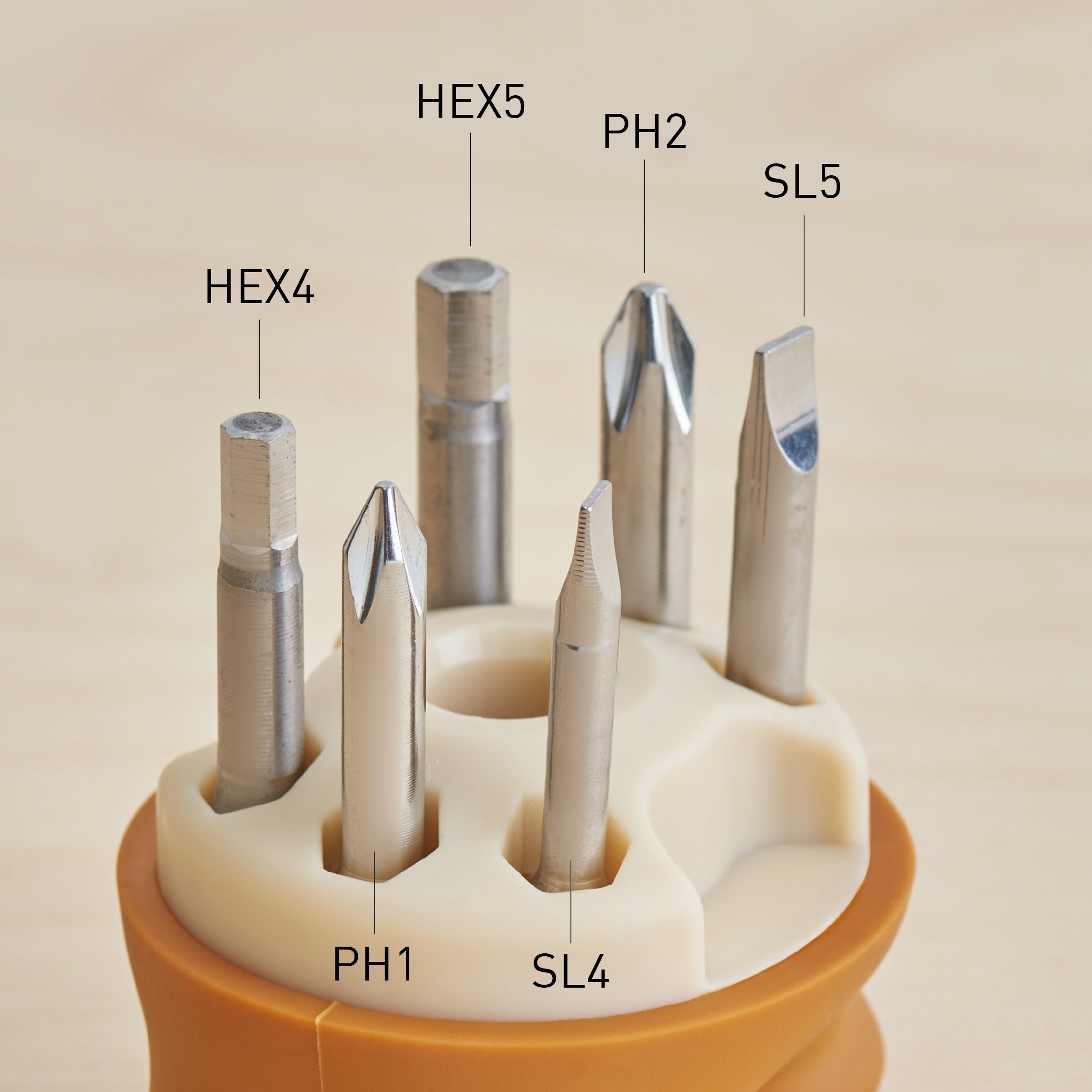 打開身體露出底盤可看到共6支不同規格尺寸的常用起子頭