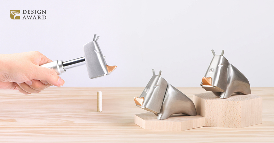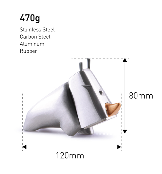 犀牛角為極具質感的金屬,除了強調犀牛的特色之外,也多了提醒物種保護與尊重的意涵,鎚子的功能可以與犀牛的動物特性直接產生聯想。